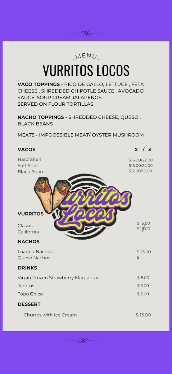 Overall, Vurritos Locos presents a menu that seamlessly blends creativity and deliciousness, with something for everyone, whether you're a fan of plant-based options, seafood, or classic comfort food with a twist.